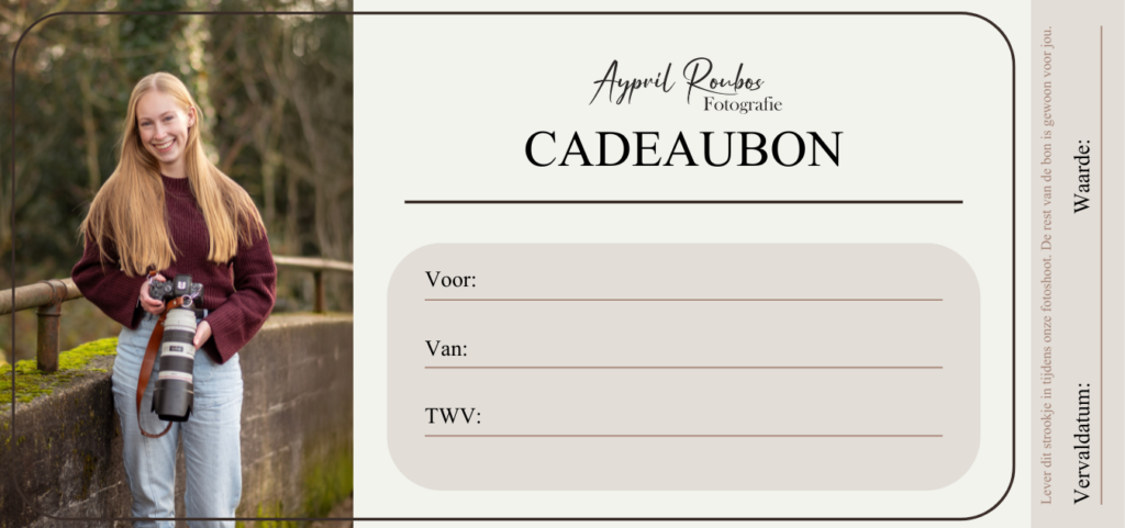Een fotoshoot cadeau doen? Ook dat kan! Voor cadeaubonnen gelden dezelfde prijzen en pakketten als voor reguliere fotoshoots. Je kan ervoor kiezen om de cadeaubon zelf uit te printen en in te pakken, maar ik kan dat ook voor je doen. Hier komen dan nog wel verzendkosten bij kijken. De cadeaubon kan je bestellen via het contactformulier.