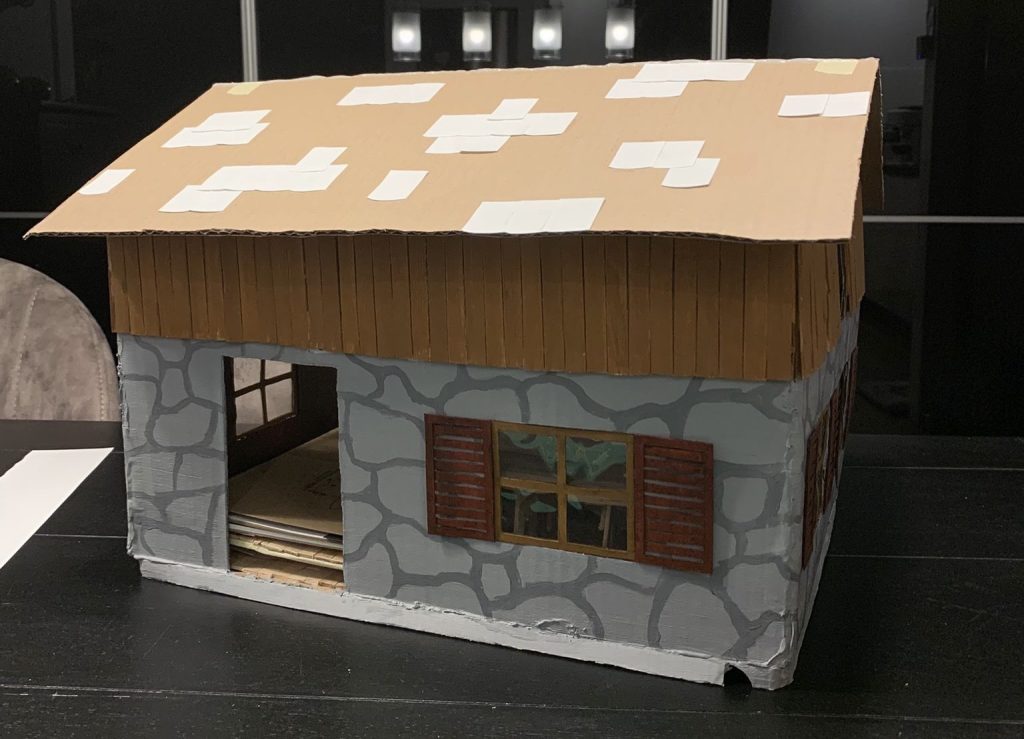 3. Ik ging de buitenkant van het huis schilderen. Ik begon met een egaal lichtgrijze laag waar ik later met een donkerdere grijze tint het stenenpatroon overheen schilderde. Ook schilderde ik de kozijnen warm bruin.